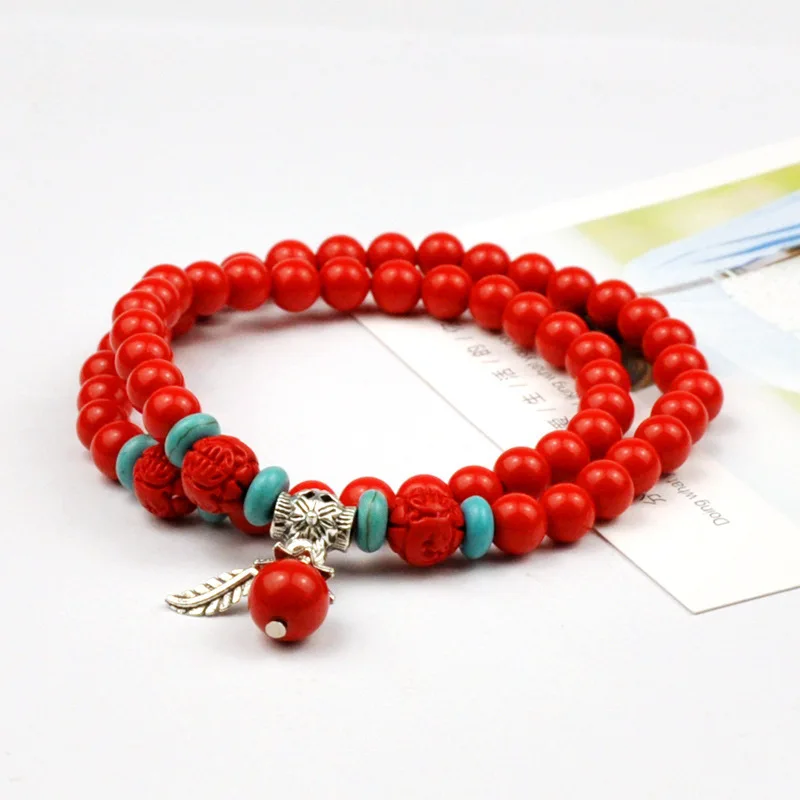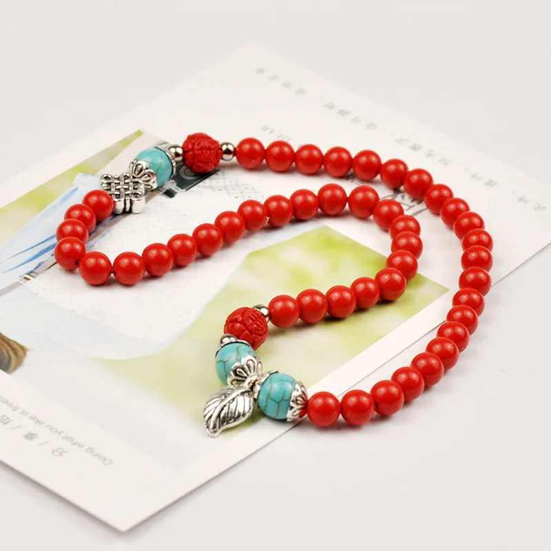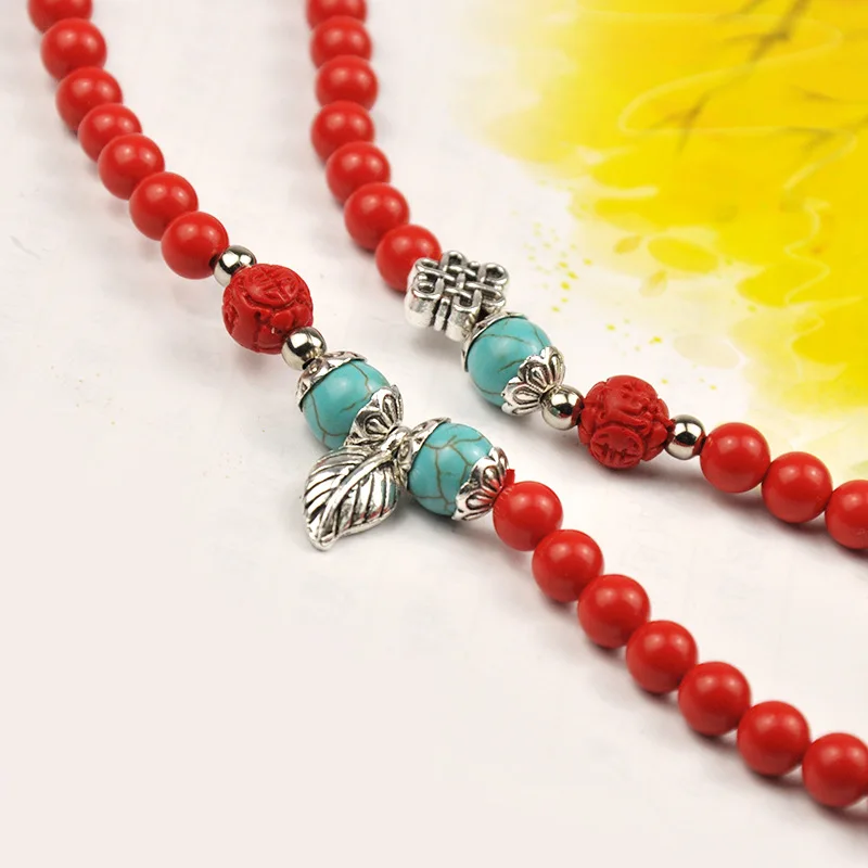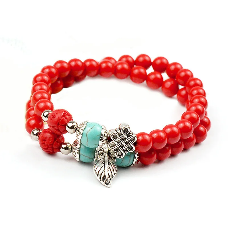 Ethnic Bracelet Women Stylish Splice Turquoise Bracelet Wholesale Gold Plated Red Cinnabar Leaf Pendant Beaded Bracelets Jewelry